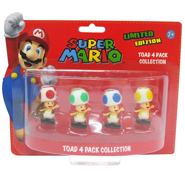 Set mit 4 Minifiguren (ca. 6cm groß). Inhalt: 1 Toad rot, 1 Toad blau, 1 Toad grün, 1 Toad gelb Original Nintendo Lizenz
