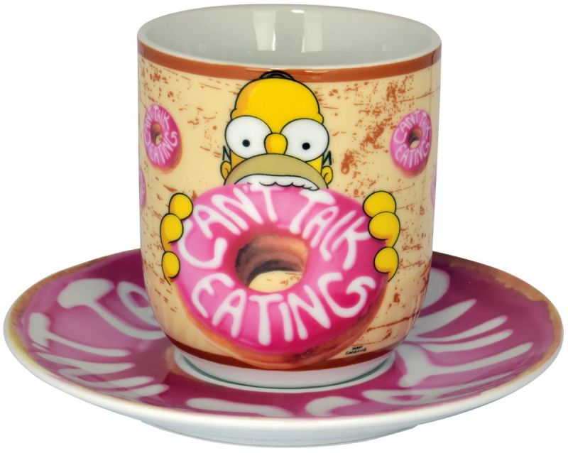 Während der Kaffeepause zum leckeren Kaffee noch einen wunderbaren Donut oder Cookie genießen…Mhm…Aber so gut er auch schmeckt, mit einem Biss wird er wohl nicht im Mund verschwinden. Daher bringt diese Tasse mit dem lustigen Homer Simpsons-Donut-Design einen Unterteller mit, der entweder losgelöst von der Tasse als kleiner Teller fungieren kann, oder aber Ablagefläche neben der Tasse bietet.