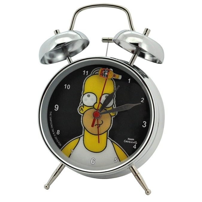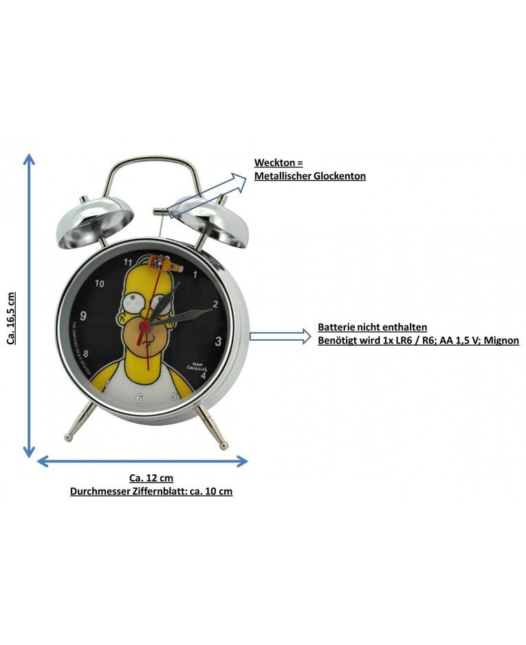 Ein Wecker, wie es ihn schon zu Großmutters Zeiten gegeben hat, nur dass diese Homer Simpson mit Sicherheit noch nicht gekannt hat! Dem Morgenmuffel hilft der Wecker dank seines kräftigen Glockentons dabei, schnell die Augen aufzubekommen (um diesen Krach am Morgen schnell zu beenden), den Ausgeschlafenen zeigt er über Tag zuverlässig was die Uhr schlägt. Dank des Wechselbilds hat Homer auch bei wechselnder Perspektive immer ein Auge darauf, das die Morgenmuffel auch aufstehen und beobachtet gekonnt, was diese den ganzen Tag danach so anstellen, sofern sie sich in seinem Blickfeld befinden. Material: Metall, Größe: Höhe ca. 17cm, Breite ca. 11 cm/ Tiefe ca. 5,5 cm/ Ø Ziffernblatt ca. 10cm, Weckton: Glockenschellen, Batterien nicht enthalten, benötigte Batterien: 1xLR6 / R6/ AA 1,5 V/ Mignon. Verpackung: Umkarton im Simpsons-Design