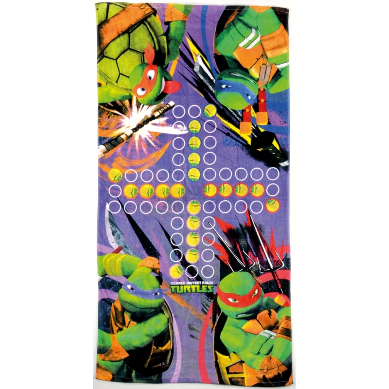 - Bestandteil der Lieferung: 1 Handtuch, 1 Netzbeutel, 16 Spielsteine (4 x 4 Steine jeweils und Farbe der Masken der Turtles Charaktere), 1 Würfel